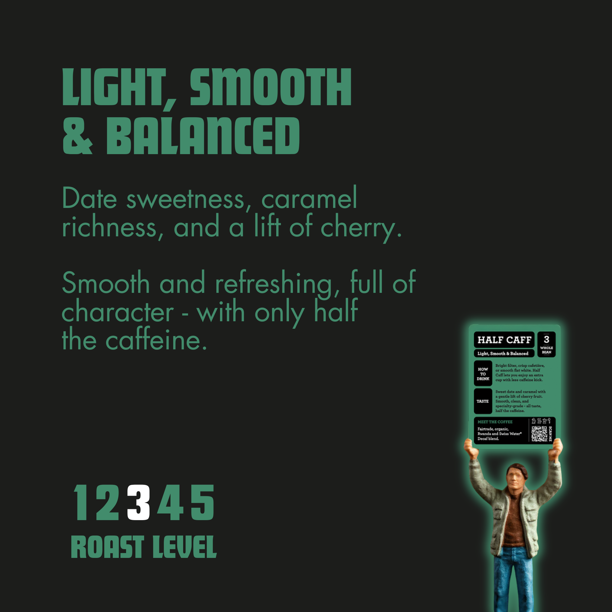 Sweet date and caramel richness meets a gentle lift of cherry fruit, wrapped in a smooth, rounded body. Balanced from first sip to last, it delivers all the depth of a full-strength specialty coffee - just with half the caffeine. Every cup is clean, easy to drink, and satisfying at any time of day.