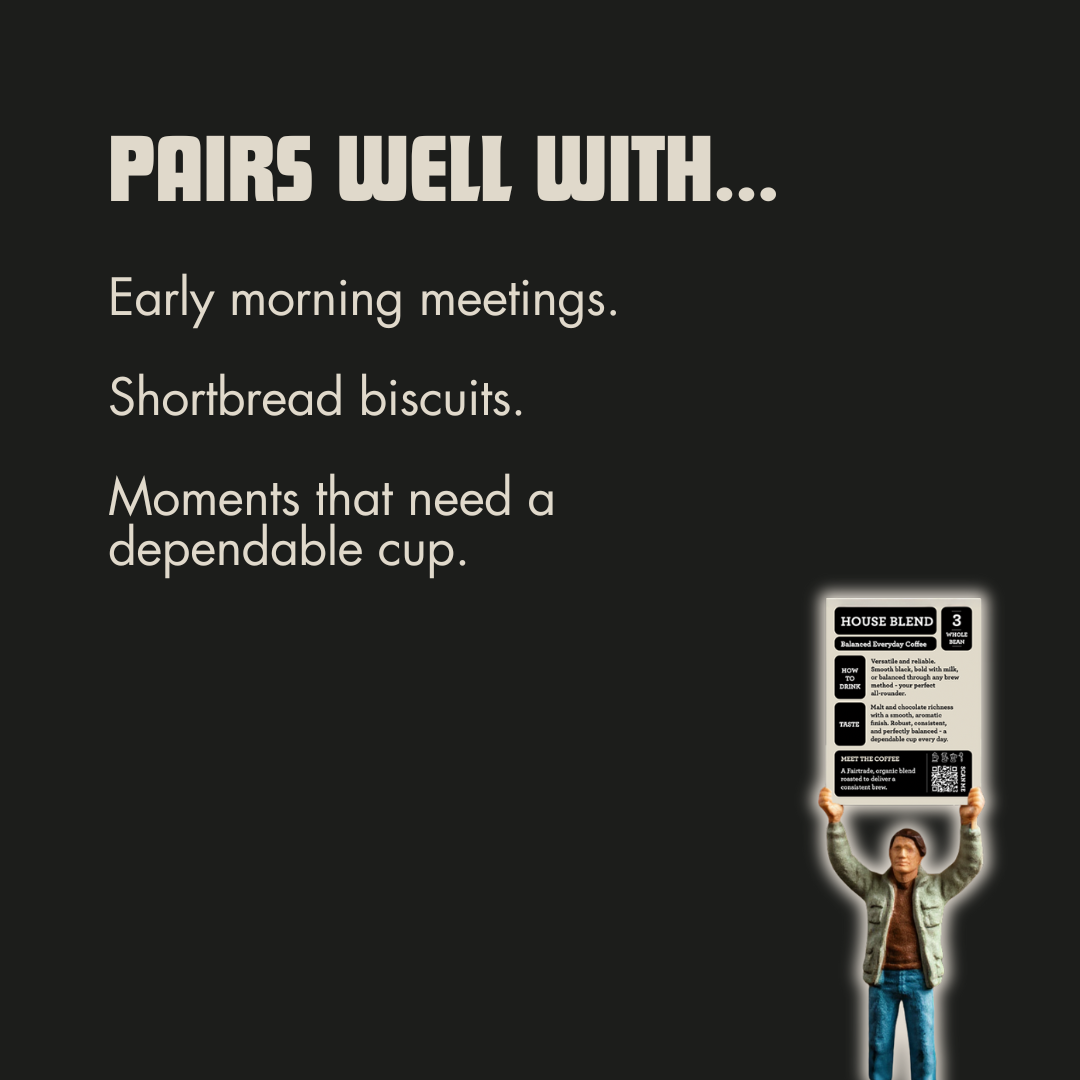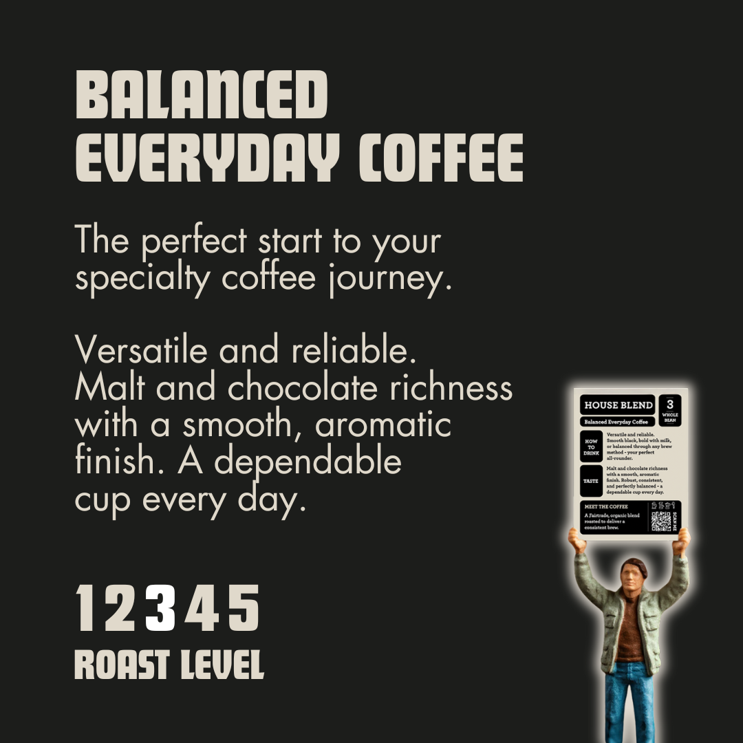 Balanced sweetness. Gentle body. A smooth, clean finish. House Blend is approachable, versatile, and a guaranteed crowd-pleaser, with or without milk.