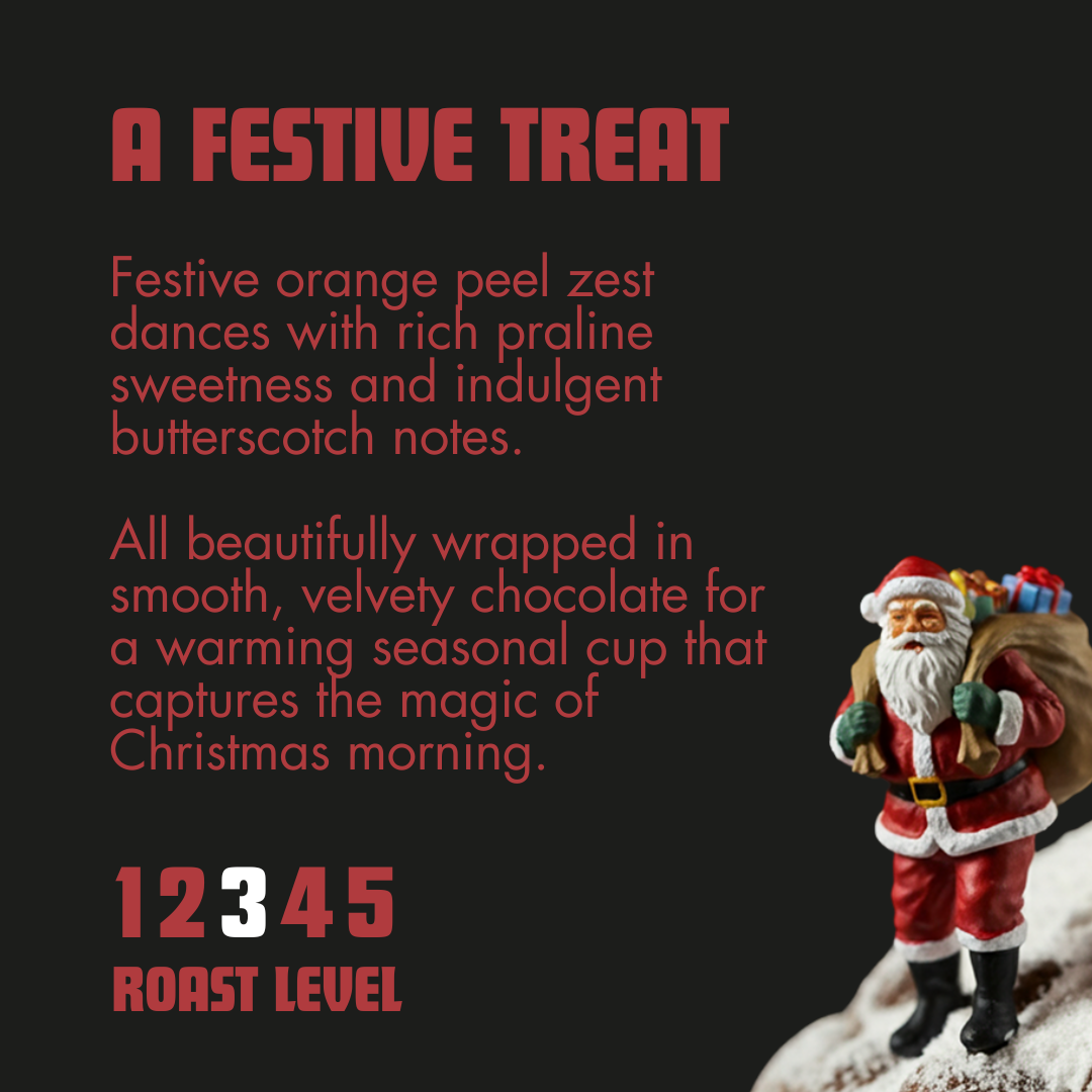 From the very first sip, festive orange peel zest dances across the palate, bright and joyful, before giving way to rich praline sweetness and indulgent butterscotch notes. Each layer is beautifully balanced, wrapped in smooth, velvety chocolate for a cup that feels as comforting as it is luxurious.
